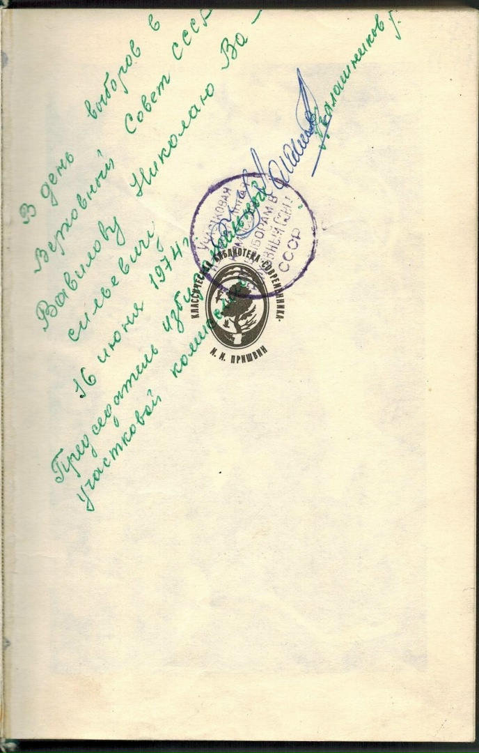 Памятные надписи в этих книгах напомнят об отдыхе в пионерлагере «Горняк», о студенческих годах, о профессиональных праздниках и о значимых событиях в стране. Среди них есть книга с надписью: «В день выборов в Верховный Совет СССР Вавилову Николаю Васильевичу. 16 июня 1974 года». Интересно, что стоит за этой надписью? Человека наградили книгой за работу в избирательной комиссии или, может быть, за то, что он первым пришел на избирательный участок?